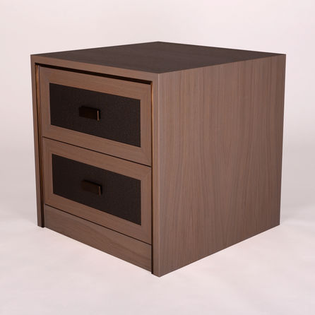 Stained oak veneer with a textured panel insert, aged brass trim and matching handle.